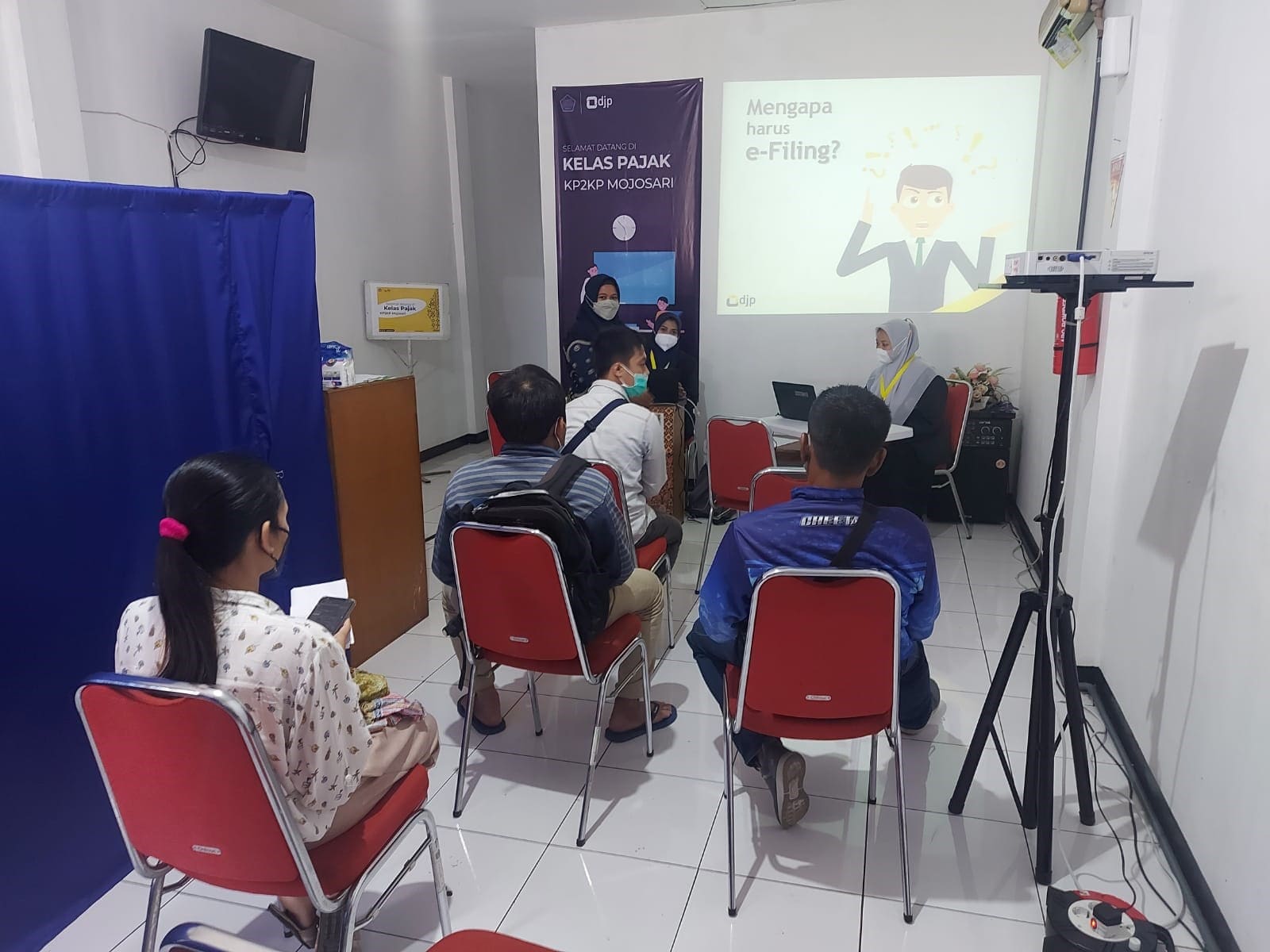 Kantor Pelayanan, Penyuluhan, dan Konsultasi Perpajakan (KP2KP) Mojosari mengadakan kelas pajak secara luring dengan tema Panduan Pengisian SPT Tahunan Melalui e-Filing di KP2KP Mojosari, Kab. Mojokerto (Selasa, 29/3).