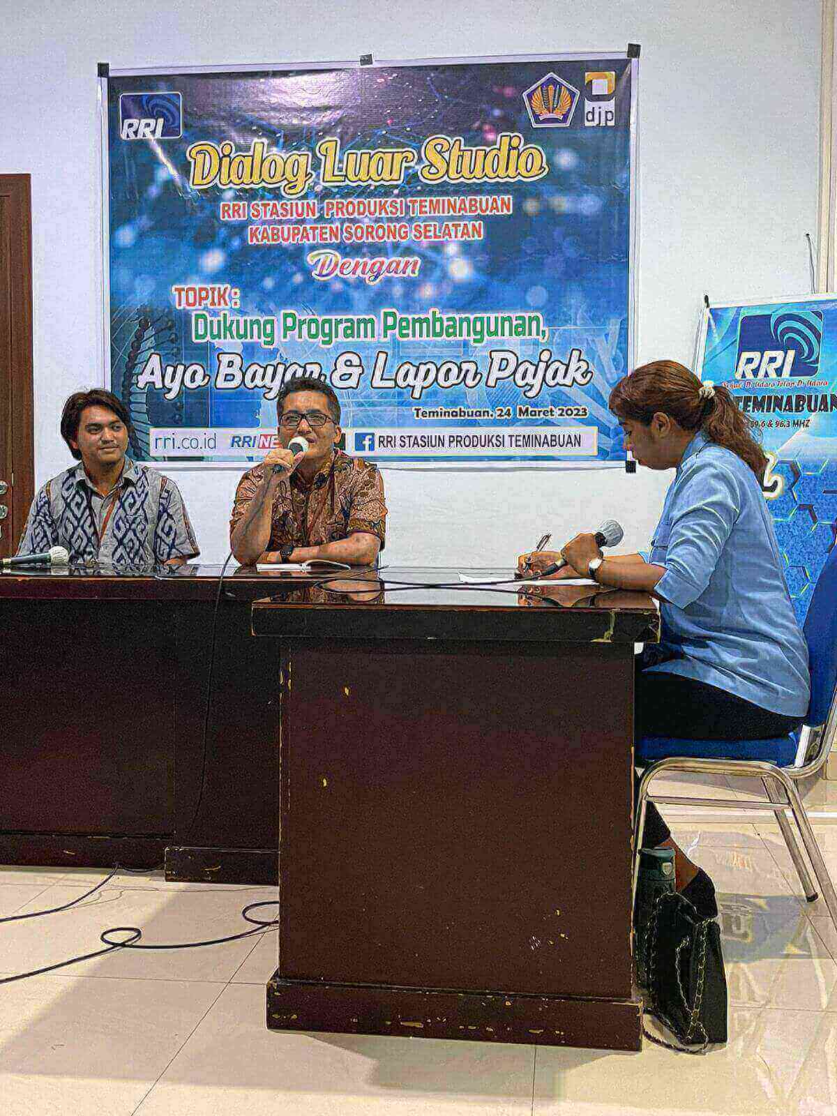 Kantor Pelayanan, Penyuluhan dan Konsultasi Perpajakan (KP2KP) Teminabuan bekerja sama dengan Radio Republik Indonesia (RRI) Teminabuan mengadakan Gelar Wicara (Talkshow) Interaktif Perpajakan bertempat di KP2KP Teminabuan, Kabupaten Sorong Selatan, Papua Barat Daya (Jumat, 24/3). Kegiatan ini bisa dilaksanakan di luar studio RRI melalui kerja sama program siaran luar studio RRI Stasiun Produksi Teminabuan.