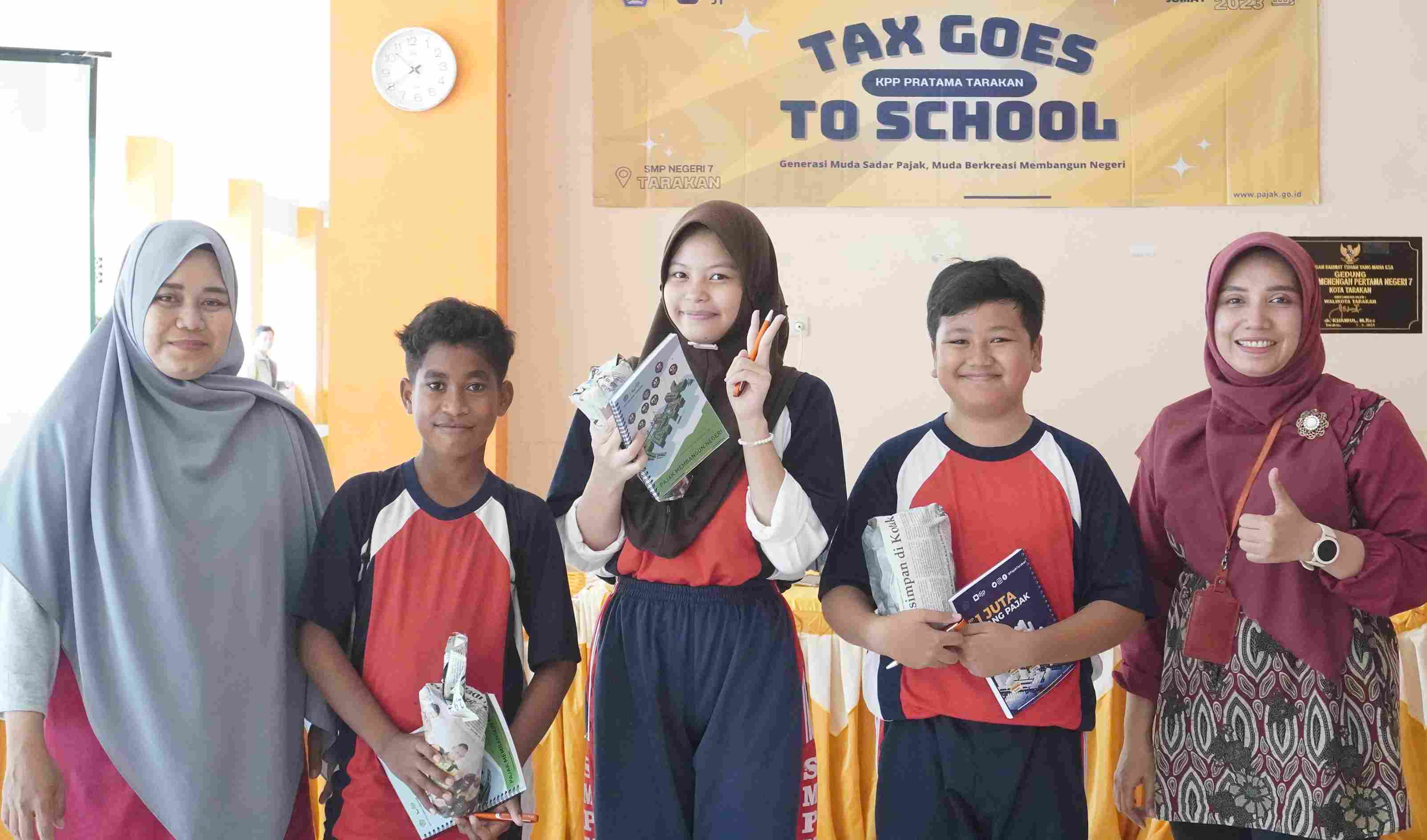Menggandeng Sekolah Menengah Pertama (SMP) Negeri 7 Tarakan, Kantor Pelayanan Pajak (KPP) Pratama Tarakan menggelar Tax Goes To School (TGTS) di Sekolah Menengah Pertama Negeri 7 Tarakan, Jalan Diponegoro, Tarakan Tengah, Kota Tarakan (Jumat, 7/7). Kegiatan tersebut merupakan bentuk kerja sama dalam rangka mengenalkan pengetahuan tentang pajak kepada generasi muda. Tema dalam acara Tax Goes To School kali ini bertajuk "Generasi Muda Sadar Pajak, Muda Berkreasi Membangun Negeri".
