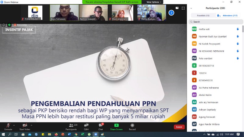 Sehubungan masih meningkatnya jumlah pasien yang terkena Corona Virus Disease 2019 (Covid-19) dan berdampak pada perekonomian di Bali, Kantor Wilayah Direktorat Jenderal Pajak Bali (Kanwil DJP Bali) mengadakan webinar (seminar web) insentif pajak bagi pelaku usaha di Bali menggunakan aplikasi Zoom Webinar (Selasa, 30/06).