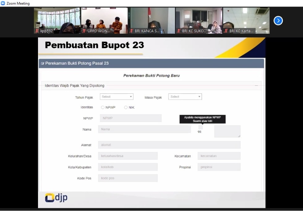 Sebagai upaya untuk meningkatkan pengetahuan dan keterampilan perpajakan, Kantor Pelayanan Pajak (KPP) Pratama Sukoharjo kembali menyelenggarakan sosialisasi aplikasi e-Bupot PPh 23/26 secara daring dari ruang rapat KPP Pratama Sukoharjo (Rabu, 4/11). Kegiatan ini diikuti oleh UPPD Kab.Sukoharjo, UPPD Kab.Wonogiri, BRI KC Sukoharjo, dan BRI KC Wonogiri beserta jajaran unit vertikalnya.