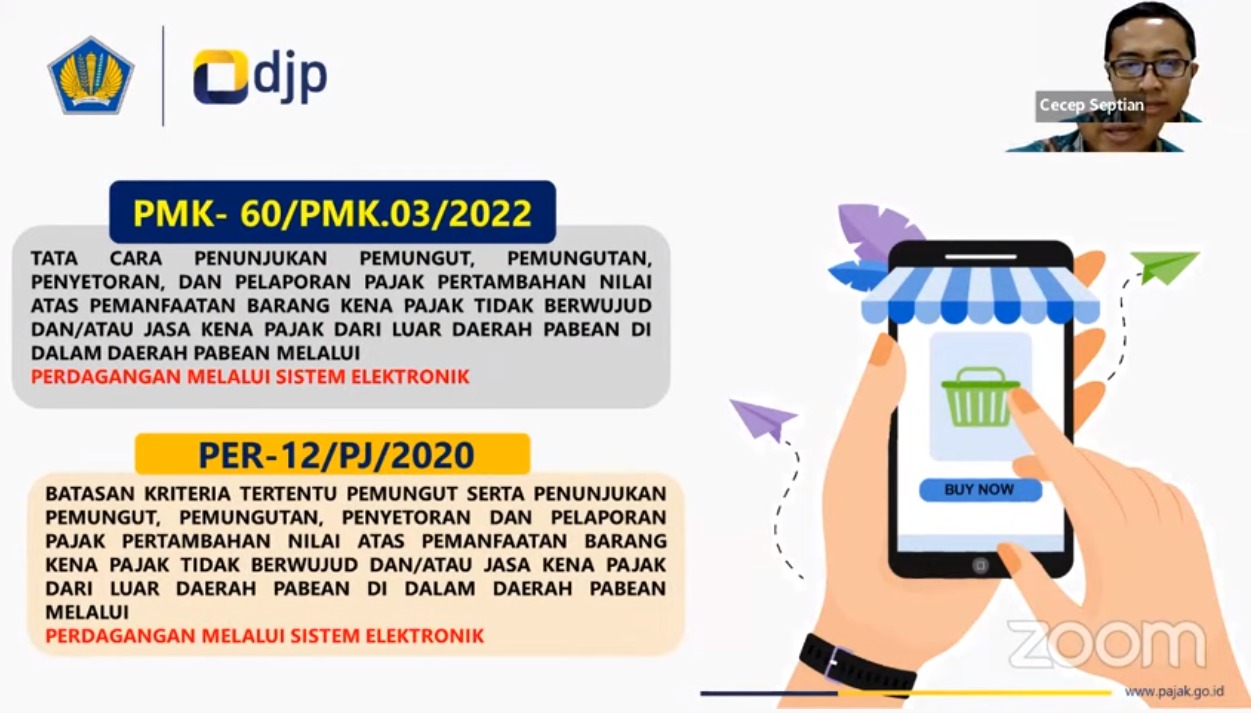 Topik yang dibahas kali ini yaitu PMK Nomor PMK-60/PMK.03/2022 tentang Tata Cara Penunjukan Pemungut, Pemungutan, Penyetoran, dan Pelaporan PPN atas Pemanfaatan Barang Kena Pajak (BKP) Tidak Berwujud dan/atau Jasa Kena Pajak (JKP) dari Luar Daerah Pabedan di dalam Daerah Pabean Melalui Perdagangan Melalui Sistem Elektronik (PMSE).