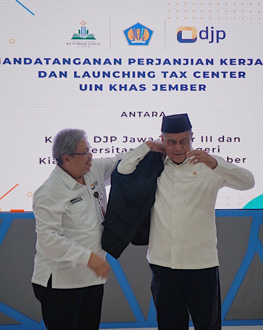 Kantor Wilayah (Kanwil) Direktorat Jenderal Pajak (DJP) Jawa Timur III mengukuhkan Wakil Bupati Jember dan Rektor Universitas Islam Kiai Haji Achmad Sidiq (UIN KHAS) Jember untuk meningkatkan jangkauan edukasi perpajakan bertempat di Gedung Kuliah Terpadu UIN KHAS Jember (Senin, 19/9).