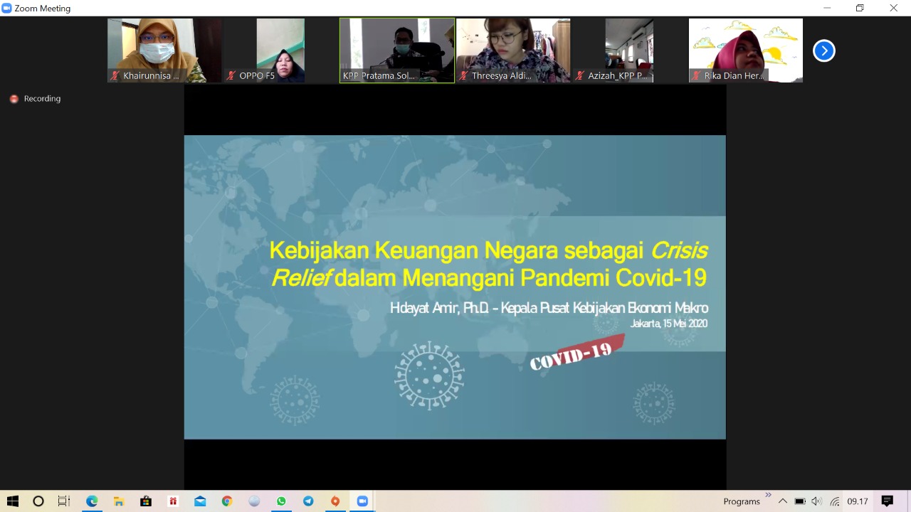 Seluruh pegawai KPP Pratama Solok mengikuti Focus Group Discussion (FGD) tentang Kebijakan Keuangan Negara sebagai Crisis Relief dalam Menghadapi Pandemi Covid-19 melalui media telekonferensi di tempat masing-masing (Jumat, 12/06).