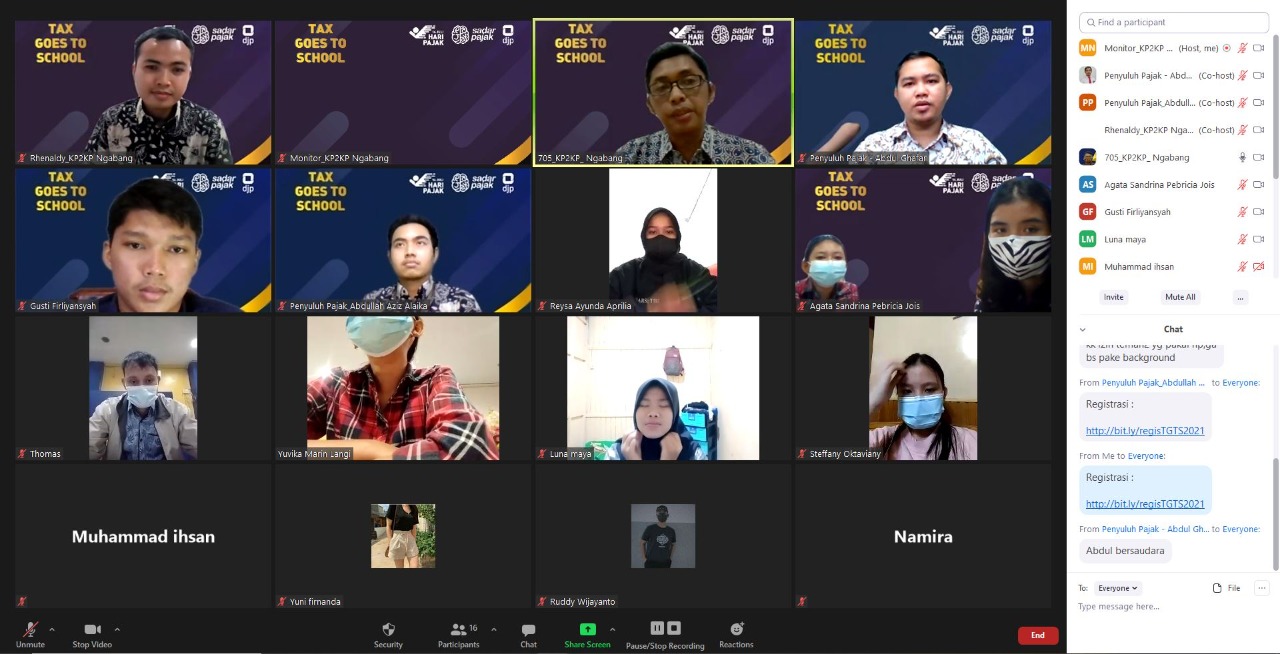 Kantor Pelayanan, Penyuluhan, dan Konsultasi Perpajakan (KP2KP) Ngabang menggelar acara Tax Goes To School (TGTS) melalui Zoom Meeting di Landak, Kalimantan Barat (Jumat, 15/7). Dalam acara ini KP2KP Ngabang menggandeng peserta dari SMA Negeri 1 Ngabang. Acara ini dipandu oleh Tenaga Penyuluh KP2KP Ngabang Venansius Fajar Sinabutar dan Rhenaldy Arista Pratama.
