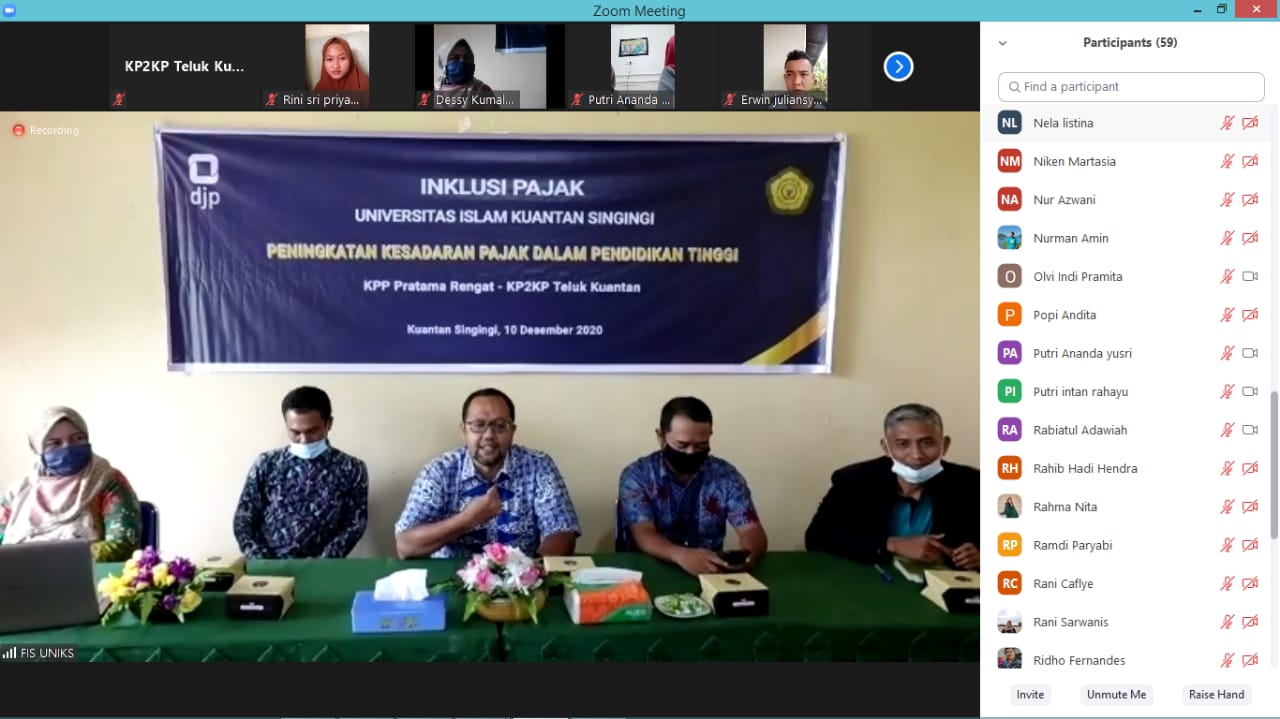 Kantor Pelayanan, Penyuluhan, dan Konsultasi Perpajakan (KP2KP) Teluk Kuantan mengadakan acara Inklusi Pajak Pendidikan Tinggi secara daring dari gedung Tax Center Universitas Islam Kuantan Singingi di Kabupaten Kuantan Singingi, Riau (Kamis 10/12). Kegiatan ini diadakan dalam rangka mengupayakan terwujudnya generasi cerdas sadar pajak.