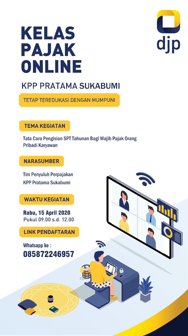 Kantor Pelayanan Pajak (KPP) Pratama Sukabumi mengadakan Kelas Pajak Daring (Online) terkait Sosialisasi dan Asistensi Pengisian SPT Tahunan Orang Pribadi melalui media grup WhatsApp (Rabu, 15/4). Kelas Pajak Daring ini diadakan untuk merespons banyaknya pertanyaan wajib pajak yang masuk melalui telepon, surat elektronik, dan pesan langsung pada medsos KPP mengenai pengisian SPT Tahunan.