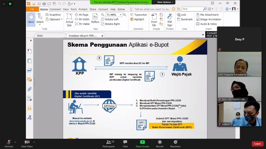 KPP Pratama Purwakarta mengadakan kegiatan sosialisasi e-Bupot (bukti potong) PPh pasal 23/26 kepada wajib pajak melalui aplikasi Zoom Meeting di Purwakarta (Kamis, 6/8). Sosialisasi ini diadakan selama dua hari sejak Rabu, 5 Agustus 2020 dengan total peserta sebanyak 68 wajib pajak.