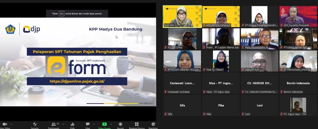 Penyuluh Pajak Kantor Pelayanan Pajak (KPP) Madya Dua Bandung menggelar kelas pajak secara daring melalui aplikasi Zoom di Ruangan Penyuluh KPP Madya Dua Bandung, Kota Bandung (Kamis, 25/5).
