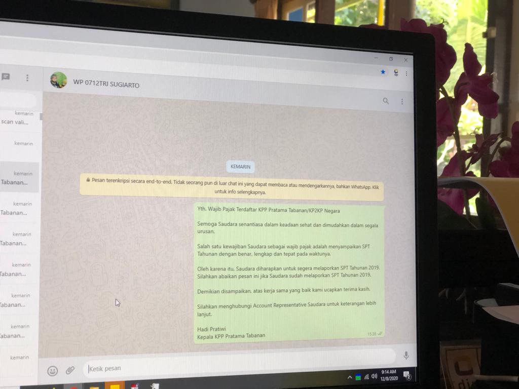 Demi meningkatkan kepatuhan pemenuhan kewajban perpajakan wajib pajak, Kantor Pelayanan, Penyuluhan, dan Konsultasi Perpajakan (KP2KP) Negara mengirim pesan imbauan secara elektronik menggunakan aplikasi WhatsApp dari Negara (Selasa, 8/12). Langkah ini merupakan salah satu cara untuk mengingatkan wajib pajak agar segera melaksanakan kewajiban perlaporan SPT Tahunan.