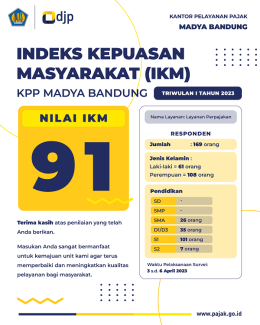 Kantor Pelayanan Pajak (KPP) Madya Bandung memperoleh Indeks Kepuasan Masyarakat (IKM) sebesar 91 poin dalam skala 1-100 untuk periode penilaian triwulan I 2023 dalam survei kepuasan wajib pajak yang dilakukan. “Hasil tersebut menunjukkan adanya peningkatan sebanyak 2,36 poin dibandingkan dengan periode sebelumnya, yang mencatatkan hasil 88,64,” demikian disampaikan oleh Kepala Seksi Pelayanan KPP Madya Bandung Meimon Putrama Amda di ruang kerjanya, Jalan Asia Afrika nomor 114, Kota Bandung (Senin, 8/5).