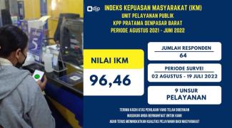 Kantor Pelayanan Pajak (KPP) Pratama Denpasar Barat berhasil meraih Indeks Kepuasan Masyarakat (IKM) sebesar 96,46% selama periode 02 Agustus 2021 sampai dengan 19 Juli 2022. Survei ini dilakukan secara langsung di Tempat Pelayanan Terpadu (TPT) KPP Pratama Denpasar Barat (Senin, 8/8). Kegiatan survei dilakukan dalam rangka Penilaian dan Evaluasi Kinerja Penyelenggaraan Pelayanan Publik (PEKPPP).