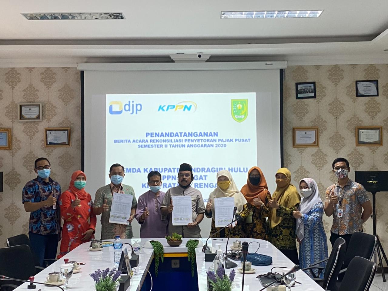 Kepala Kantor Pelayanan Pajak (KPP) Pratama Rengat Surjo Adjie Pranoto bersama dengan Pemerintah Daerah (Pemda) Kabupaten Indragiri Hulu dan Kepala KPPN Rengat Hermawan Sukoasih melakukan penandatanganan rekonsilitasi penyetoran pajak pusat semester II tahun 2020 di Riau (Jumat, 5/2).
