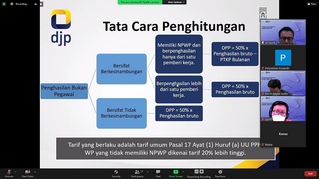 Kegiatan berlangsung selama 120 menit dan dilaksanakan secara daring melalui aplikasi zoom meeting. Fungsional Penyuluh KPP Pratama Kosambi sebagai narasumber kelas pajak mengingatkan para peserta tentang pentingnya kewajiban pembuatan bukti potong 1721 A1 sebelum batas akhir pelaporan SPT Tahunan PPh Orang Pribadi.