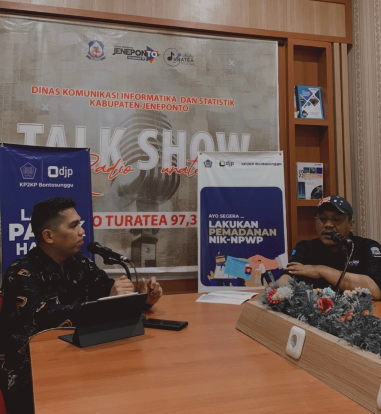 Kantor Pelayanan, Penyuluhan dan Konsultasi Perpajakan (KP2KP) Bontosunggu bekerja sama dengan Dinas Komunikasi, Informasi dan Statistik (Diskominfotik) Kabupaten Jeneponto serta Radio Turatea FM mengajak seluruh Wajib Pajak Jeneponto untuk segera melakukan Pelaporan SPT Tahunan dan Pemadanan Nomor Induk Kependudukan (NIK) sebagai Nomor Pokok Wajib Pajak (NPWP) dalam kegiatan talkshow radio (Selasa, 28/3). Acara disiarkan secara langsung pada saluran 97,3FM dan juga melalui live streaming YouTube dan Facebook Diskominfotik Kabupaten Jeneponto.