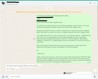 Kantor Pelayanan Pajak (KPP) Pratama Singaraja mengirim imbauan pelunasan tunggakan pajak melalui whatsapp blast kepada seluruh wajib pajak di wilayah Kabupaten Buleleng (Senin, 30/1). Sasaran wajib pajak yang dikirim whatsapp blast adalah Wajib Pajak Orang Pribadi dan wajib pajak badan yang masih memiliki tunggakan pajak yang belum dilunasi. Dasar tunggakan tersebut terdiri dari Surat Tagihan Pajak (STP), Surat Ketetapan Kurang Bayar (SKPKB), dan/atau Surat Teguran.
