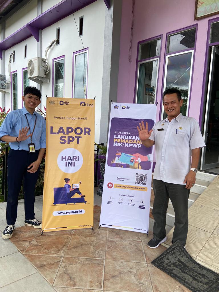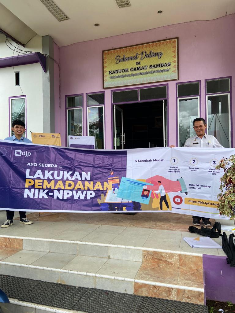 Kantor Pelayanan Penyuluhan dan Konsultasi Perpajakan (KP2KP) Sambas memasang spanduk dan standing banner (x-banner) imbauan Lapor SPT Tahunan dan Pemadanan NIK-NPWP di Kantor Camat Sambas, Kabupaten Sambas (Rabu, 8/2). Kegiatan ini dilakukan dalam rangka sosialisasi Pemadanan NIK-NPWP dan pelaporan SPT Tahunan. Pemasangan x-banner ini dilakukan oleh Pelaksana KP2KP Sambas Heru Julyansyah Putra bekerja sama dengan petugas Kantor Camat Sambas.