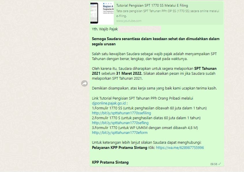 Kantor Pelayanan Pajak (KPP) Pratama Sintang mengirimkan SMS, surel dan Whatsapp (WA) kepada para wajib pajak untuk untuk segera memenuhi kewajiban perpajakannya yaitu melaporkan Surat Pemberitahuan (SPT) Tahunan Pajak Penghasilan (PPh) Orang Pribadi, Sintang (Jumat, 18/2). Menurut Kepala Seksi Pengawasan II KPP Pratama Sintang Dwi Antoro Setyawan, kegiatan tersebut sudah dilaksanakan sejak bulan januari sebagai pesan pengingat kepada wajib pajak untuk tidak lupa memenuhi kewajiban perpajakannya yaitu melaporkan SPT Tahunan.