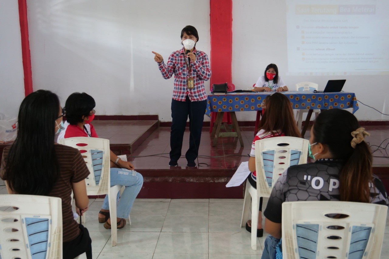Lurah Kelurahan Airmadidi Bawah Silvana Diana Bolang selaku Relawan Pajak non Mahasiswa mengadakan edukasi dan penyuluhan Bea Meterai kepada perangkat pemerintahan dan masyarakat desa Airmadidi Bawah. Kegiatan dilaksanakan di Kantor Kelurahan Airmadidi Bawah, Kabupaten Minahasa Utara, Sulawesi Utara (Kamis, 12/8).
