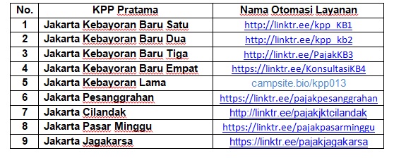 Selanjutnya mewakili Kepala Bidang P2Humas, Kepala Seksi Kerja Sama dan Humas Teguh Sulistyo, senada dengan Ruth mengungkapkan aplikasi otomasi pelayanan KPP tersebut sangat bermanfaat. Wajib pajak cukup klik tombol linktree KPP, otomatis akan terhubung dengan daftar seluruh layanan KPP. Berikut daftar aplikasi otomasi pelayanan KPP di lingkungan Kanwil DJP Jakarta Selatan II :