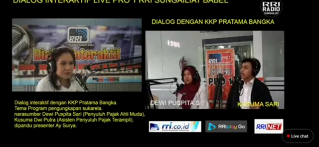 Dialog interaktif dibawakan oleh Fungsional Penyuluh Pajak KPP Pratama Bangka, Dewi Puspita Sari dan Kusuma Dwi Putra, dan dipandu oleh Ay Surya, Presenter RRI Pro1 Sungailiat secara langsung dari Studio Pro1 RRI Sungailiat.