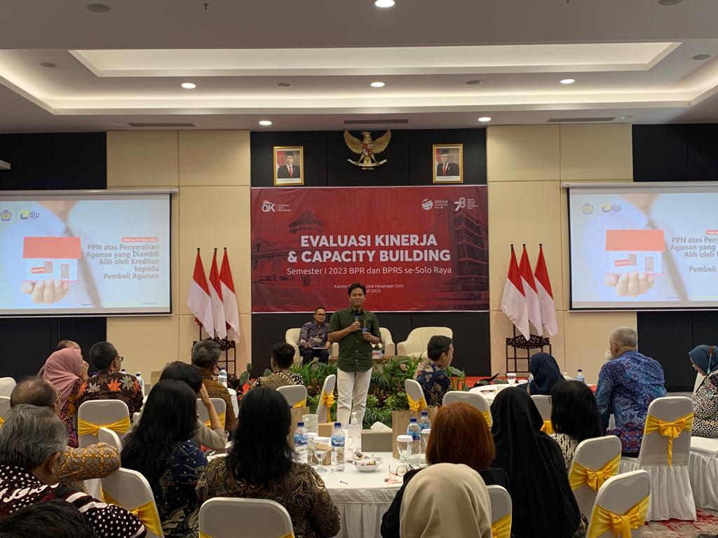 Kanwil DJP Jateng II menghadiri acara Evaluasi Kinerja dan Capacity Building yang diadakan oleh OJK Solo (Selasa, 27/7). Surono dan Wieka Wintari selaku tim penyuluh Kanwil Jateng II menjadi narasumber materi perpajakan pada acara yang diikuti oleh BPR dan BPRS se-Solo Raya ini. Acara dilaksanakan dengan tujuan meningkatkan pemahaman wajib pajak terkait PPN atas Penyerahan Agunan yang diambil Alih (AYDA) oleh kreditur kepada pembeli agunan.