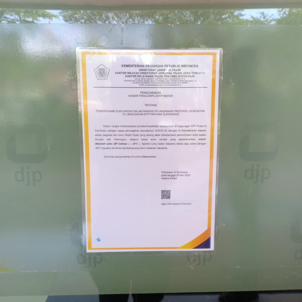 Dalam rangka persiapan layanan tatap muka yang akan dibuka pada tanggal 15 Juni 2020, KPP Pratama Sukoharjo tengah melakukan berbagai persiapan sesuai panduan pemerintah terkait pencegahan dan pengendalian Covid-19, bertempat di KPP Pratama Sukoharjo (Jumat, 5/6). Persiapan ini telah dilaksanakan sejak tanggal 2 Juni 2020.