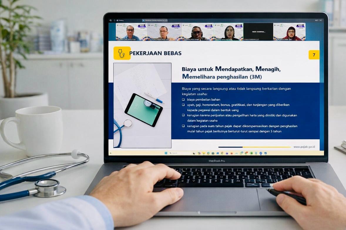 Narasumber lainnya, penyuluh pajak, Yola Angelina Togatorop, memaparkan mekanisme penghitungan pajak untuk pekerjaan bebas. Dokter dengan peredaran bruto kurang dari Rp4,8 miliar dalam satu tahun pajak dapat menggunakan Norma Penghitungan Penghasilan Neto (NPPN) sebesar 50 persen dari penghasilan bruto, dengan syarat menyampaikan pemberitahuan kepada Direktorat Jenderal Pajak dalam tiga bulan pertama tahun pajak. “Alternatifnya, wajib pajak dapat menyelenggarakan pembukuan dan mengurangkan biaya yang memenuhi prinsip 3M, yakni untuk mendapatkan, menagih, dan memelihara penghasilan,” ucapnya.