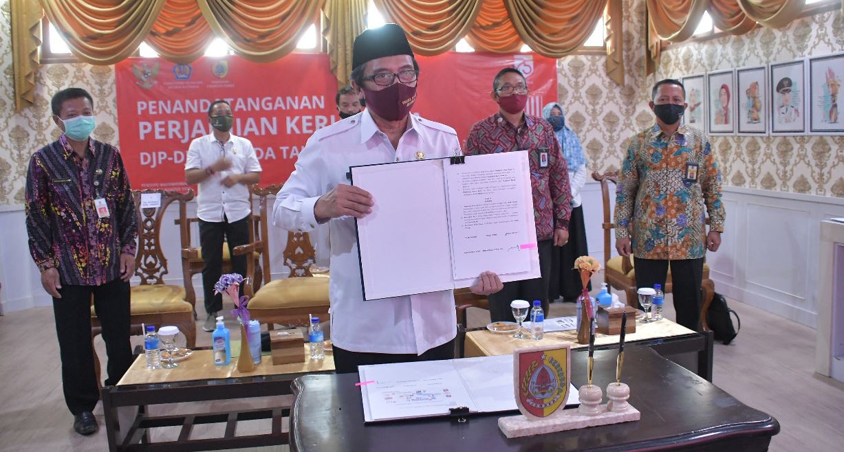 Wakil Bupati Jember Drs. KH. A. Muqit Arief menandatangani perjanjian kerja sama optimalisasi pemungutan pajak pusat dan daerah dengan Direktorat Jenderal Pajak dan Direktorat Jenderal Perimbangan Keuangan secara virtual di ruang rapat Pendapa Wahyawibawagraha, Kabupaten Jember (Rabu, 26/8). .