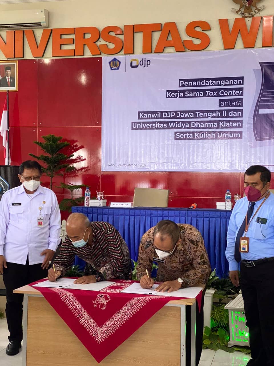 Kantor Wilayah (Kanwil) DJP Jawa Tengah II bersama dengan Universitas Widya Dharma (Unwidha) Klaten melaksanakan penandatanganan Memorandum of Understanding (MoU) Tax Center di Klaten (Rabu, 24/11). Penandatanganan dilaksanakan langsung oleh Kepala Kanwil DJP Jawa Tengah II Slamet Sutantyo dan Rektor Unwidha Klaten Prof. Triyono. Turut hadir pula, Asisten Pemerintahan dan Kesejahteraan Rakyat Sekretariat Daerah Kabupaten Klaten Ronny Roekminto.