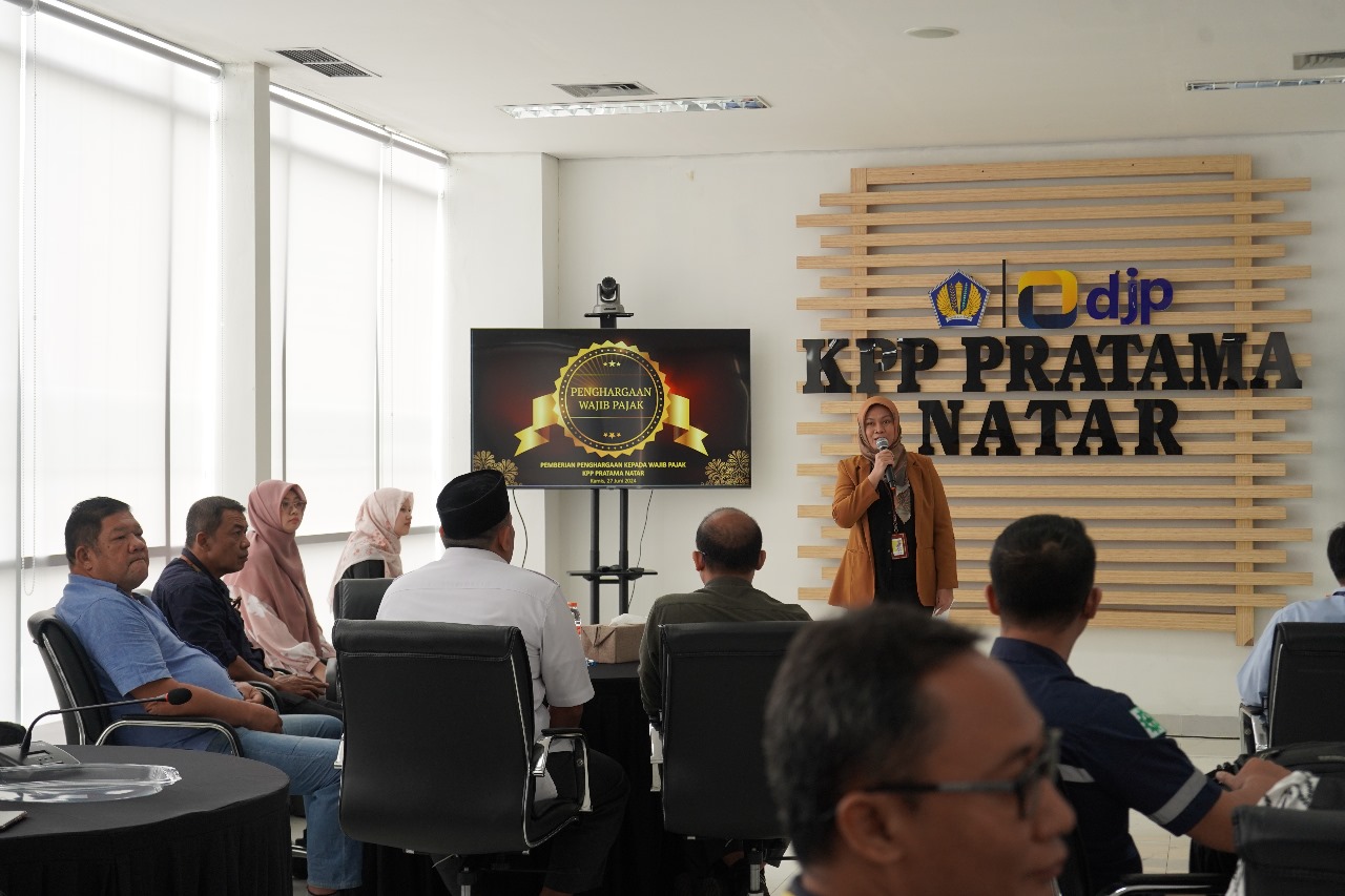 Kantor Pelayanan Pajak (KPP) Pratama Natar menggelar acara penghargaan bagi wajib pajak yang terdaftar di wilayah kerjanya. Sepuluh wajib pajak yang telah memberikan kontribusi signifikan dalam pembayaran pajak pada tahun 2023 dan telah melaporkan Surat Pemberitahuan (SPT) Tahunan secara tepat waktu mendapatkan apresiasi. Acara ini berlangsung di Ruang Rapat KPP Pratama Natar, Kabupaten Lampung Selatan (Kamis, 27/6).