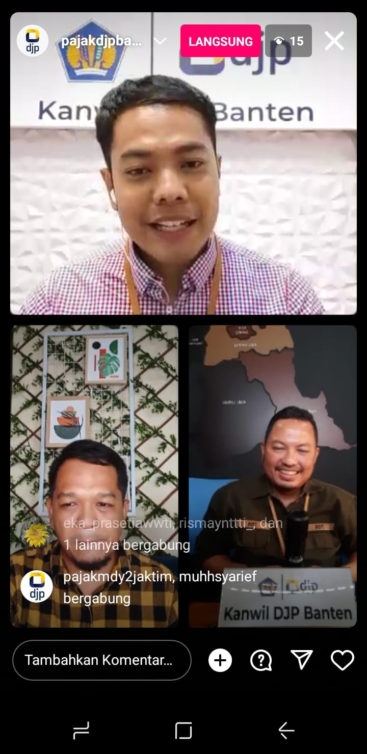 Live Instagram ini dipandu oleh Muslih Anwari, Penyuluh Kantor Wilayah Direktorat Jenderal Pajak Banten. Narasumber pada kegiatan tersebut yaitu Firstiyana Amin Ningno dari Kantor Wilayah Direktorat Jenderal Pajak Daerah Istimewa Yogyakarta dan Agus Puji Priyono dari Kantor Wilayah Direktorat Jenderal Pajak Banten.