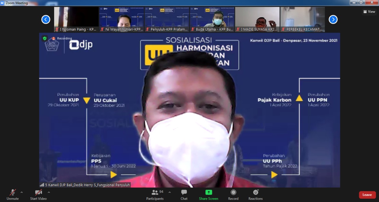 Kantor Wilayah DJP Bali bekerja sama dengan KP2KP se-Bali menyelenggarakan kegiatan edukasi perpajakan secara daring melalui zoom cloud meeting di Kanwil DJP Bali, Denpasar (Selasa, 23/11). Kegiatan edukasi ini menyasar wajib pajak orang pribadi non pengusaha kena pajak di wilayah Provinsi Bali.