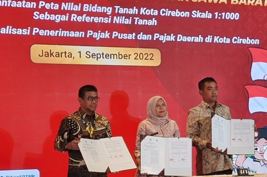 Wali Kota Cirebon Nashrudin Azis, Kepala Agraria Tata Ruang/Badan Pertanahan Nasional (ATR/BPN) Kota Cirebon Ruminah, dan Kepala Kantor Wilayah Direktorat Jenderal Pajak (Kanwil DJP) Jawa Barat II Harry Gumelar menandatangani Perjanjian Kerja Sama (PKS) pemanfaatan peta nilai bidang tanah Kota Cirebon sebagai nilai referensi harga tanah dalam rangka optimalisasi penerimaan pajak pusat dan pajak daerah di Kota Cirebon (Kamis, 1/9). Acara tersebut diselipkan pada kegiatan Rapat Kerja Teknis Direktorat Jenderal Pengadaan Tanah dan Pengembangan Pertanahan Tahun 2022.