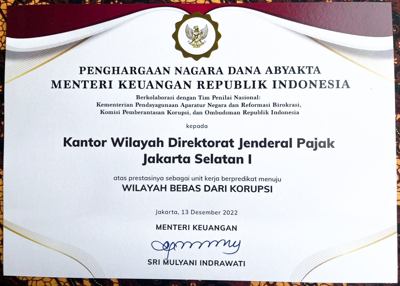 Setelah melalui perjalanan penilaian panjang dan berjenjang. Hasilnya, pada akhir 2022 Kanwil DJP Jakarta Selatan I berhasil menjadi salah satu instansi vertikal DJP yang meraih predikat ZI-WBK. Predikat ini diberikan oleh Kementerian Pendayagunaan Aparatur Negara dan Reformasi Birokrasi (PANRB) dalam acara Apresiasi dan Penganugerahan Zona Integritas Menuju Wilayah Bebas dari Korupsi/Wilayah Birokrasi Bersih Melayani Tahun 2022.