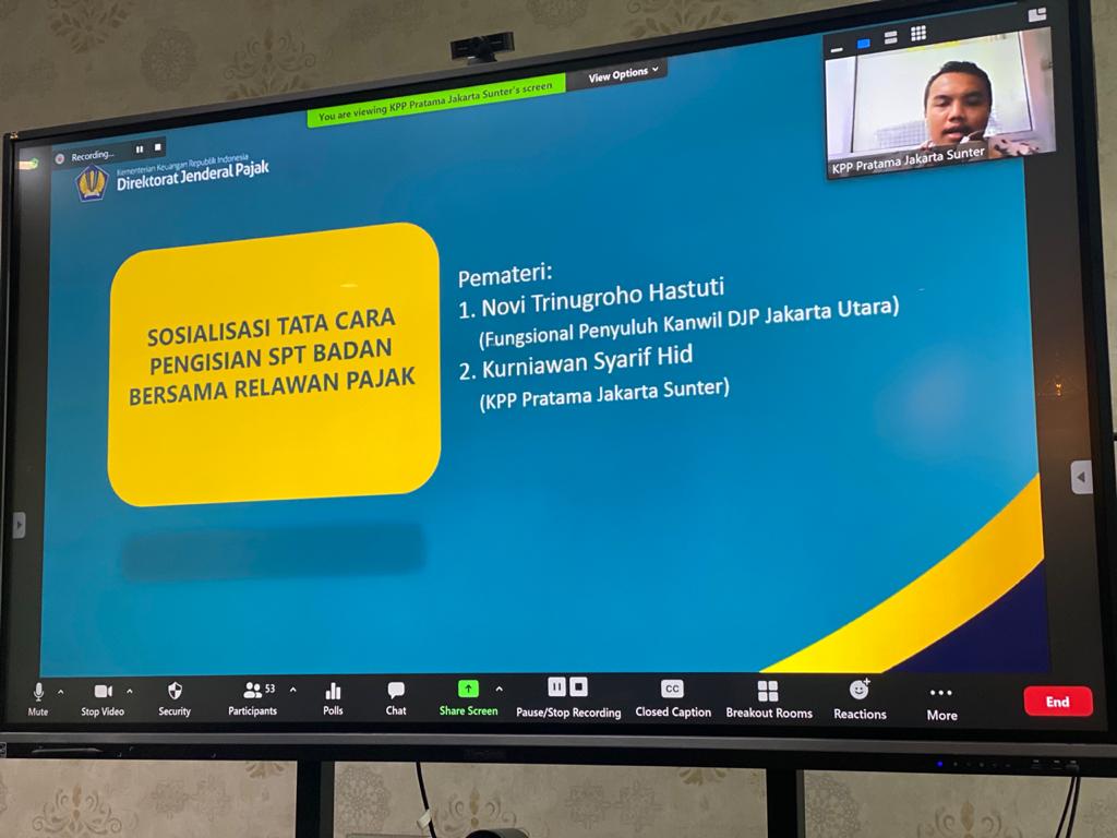 Kantor Wilayah (Kanwil) Direktorat Jenderal Pajak (DJP) Jakarta Utara menyosialisasikan pajak ke Relawan Pajak secara daring melalui media Zoom Cloud Meeting di Jakarta (Jumat, 9/4). Topik acara ini adalah “Sosialisasi Tata Cara Pengisian SPT Tahunan Badan Bersama Relawan Pajak”. Tujuannya untuk memantapkan pengetahuan pajak para Relawan Pajak, khususnya tentang Surat Pemberitahuan (SPT) Tahunan Badan agar mereka dapat membantu Kantor Pelayanan Pajak (KPP) melayani Wajib Pajak Badan menyampaikan SPT Tahunan yang berakhir 30 April.