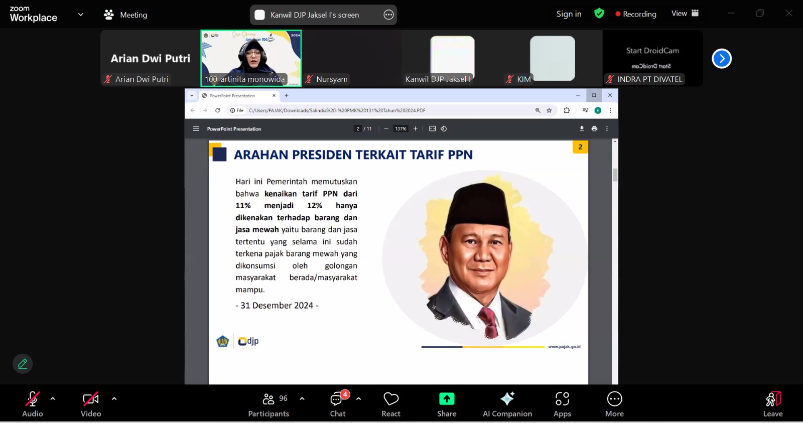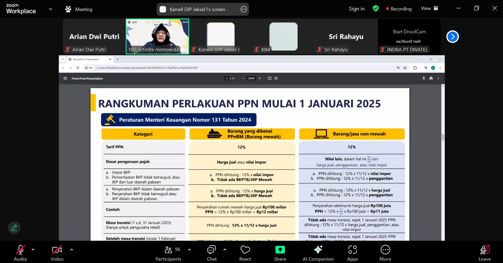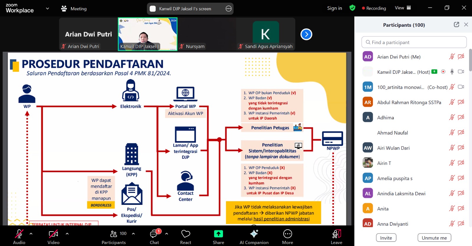 Kantor Wilayah Direktorat Jenderal Pajak (Kanwil DJP) Jakarta Selatan I mengadakan edukasi kepada lebih dari seratus wajib pajak mengenai implementasi Peraturan Menteri Keuangan (PMK) Nomor 81 Tahun 2024 dan PMK Nomor 131 Tahun 2024. Kegiatan dilaksanakan secara daring melalui aplikasi Zoom Meeting (Rabu, 8/1).