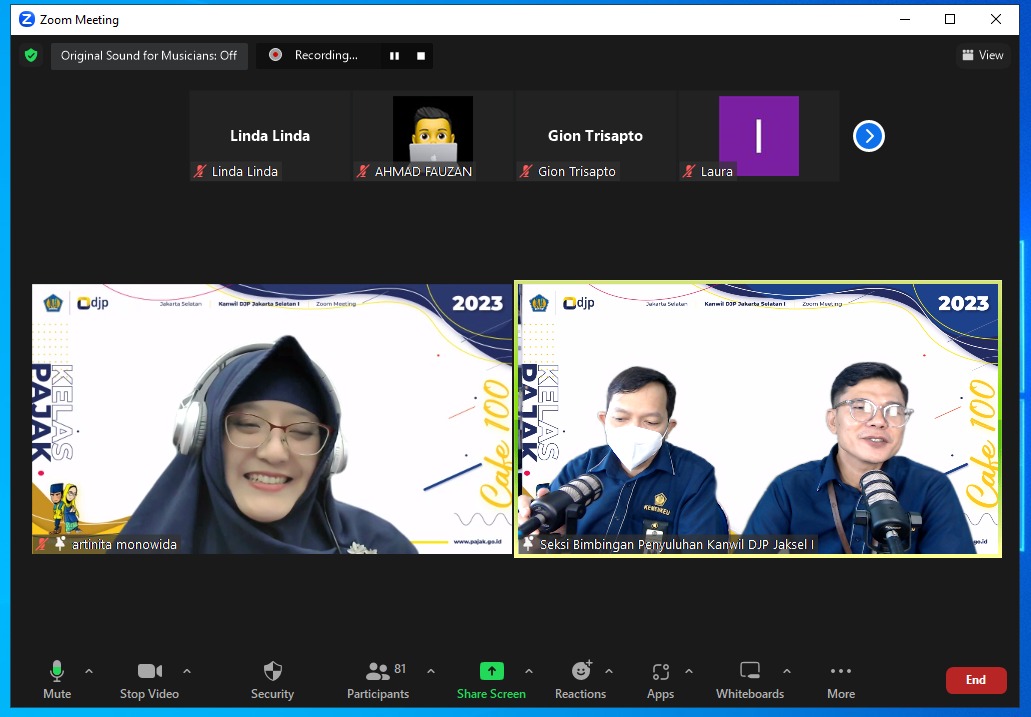 Kantor Wilayah Direktorat Jenderal Pajak (Kanwil DJP) Jakarta Selatan I menyelenggarakan sosialisasi aturan turunan Undang-Undang Harmonisasi Peraturan Perpajakan (UU HPP) PMK 66 Tahun 2023 tentang Perlakuan Pajak Penghasilan atas Penggantian atau Imbalan Sehubungan dengan Pekerjaan atau Jasa dalam Bentuk Natura dan/atau Kenikmatan secara daring melalui aplikasi Zoom Meeting di Jakarta (Rabu, 12/7).