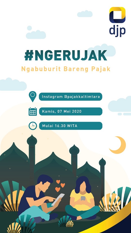 Memasuki bulan suci Ramadan 1441 Hijriah, Kantor Wilayah Direktorat Jenderal Pajak Kalimantan Timur dan Utara (Kanwil DJP Kaltimtara) menyapa wajib pajak di lingkungan Kalimantan Timur dan Kalimantan Utara melalui NGERUJAK. NGERUJAK atau Ngabuburit Bareng Pajak merupakan inovasi Kanwil DJP Kaltimtara dalam memberikan penyuluhan perpajakan secara daring melalui fitur Live pada akum insatgram @pajakkaltimtara (Kamis, 7/5).