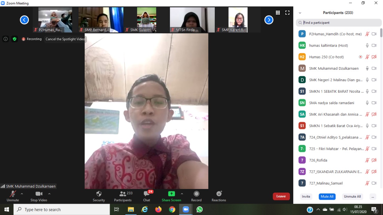 Kantor Wilayah Direktorat Jenderal Pajak Kalimantan Timur dan Utara (Kanwil DJP Kaltimtara) menyelenggarakan kegiatan Pajak Bertutur yang merupakan rangkaian peringatan Hari Pajak Tahun 2020. Kegiatan ini diikuti oleh 233 siswa SMP dan SMA sederajat di wilayah Kalimantan Timur dan Kalimantan Utara secara daring melalui aplikasi Zoom Meeting di Kanwil DJP Kaltimtara, Balikpapan (Rabu, 15/07).