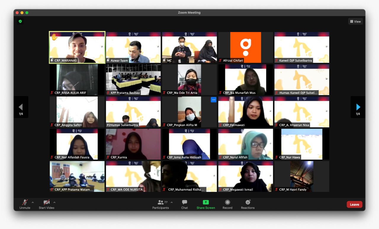 Kanwil DJP Sulawesi Selatan, Barat, dan Tenggara (Sulselbartra) resmi mengukuhkan 78 relawan pajak terpilih usai menyelesaikan tiga sesi pembekalan materi perpajakan yang diadakan dalam tiga hari pelaksanaan pelatihan secara daring, Makassar (Rabu, 27/1). Acara seremonial pengukuhan dilangsungkan di ruang Bidang P2 Humas di Gedung Kanwil DJP Sulselbartra dengan menghadirkan dua orang perwakilan mahasiswa relawan pajak terpilih.