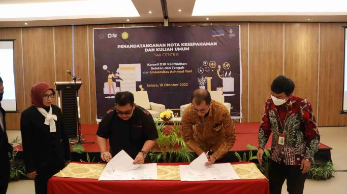 Kerja sama tax center antara Kantor Wilayah Direktorat Jenderal Pajak Kalimantan Selatan dan Tengah (Kanwil DJP Kalselteng) dan Universitas Achmad Yani (Uvaya) Banjarmasin resmi terjalin. Hal ini ditandai dengan penandatanganan Memorandum of Understanding (MoU) oleh Kepala Kanwil DJP Kalselteng Tarmizi dan Rektor Uvaya Hastirullah Fitrah di Ballroom TreePark Hotel Banjarmasin (Selasa, 18/10).