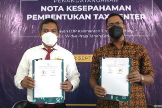 Kantor Wilayah DJP Kalimantan Timur dan Utara bersama Sekolah Tinggi Ilmu Ekonomi (STIE) Widya Praja Tanah Grogot sepakat menandatangani Nota Kesepahaman Pembentukan Tax Center yang bertempat di aula STIE Widya Praja Tanah Grogot, Kab. Paser (Senin, 12/09). Penandatangan MoU dilakukan secara langsung oleh Kepala Kantor Wilayah DJP Kalimantan Timur dan Utara Max Darmawan bersama Ketua STIE Widya Praja Muhammad Akbar.