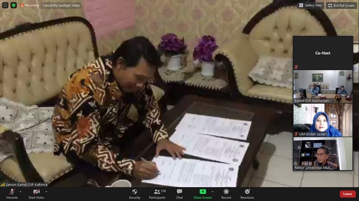 Kepala Kantor Wilayah Direktorat Jenderal Pajak Kalimantan Timur dan Utara (Kanwil DJP Kaltimtara) Samon Jaya menandatangani nota kesepahaman kerja sama Direktorat Jenderal Pajak dengan tiga Perguruan Tinggi di Balikpapan sebagai Tax Center, bertempat di ruang kerjanya, Balikpapan (Rabu, 22/7).