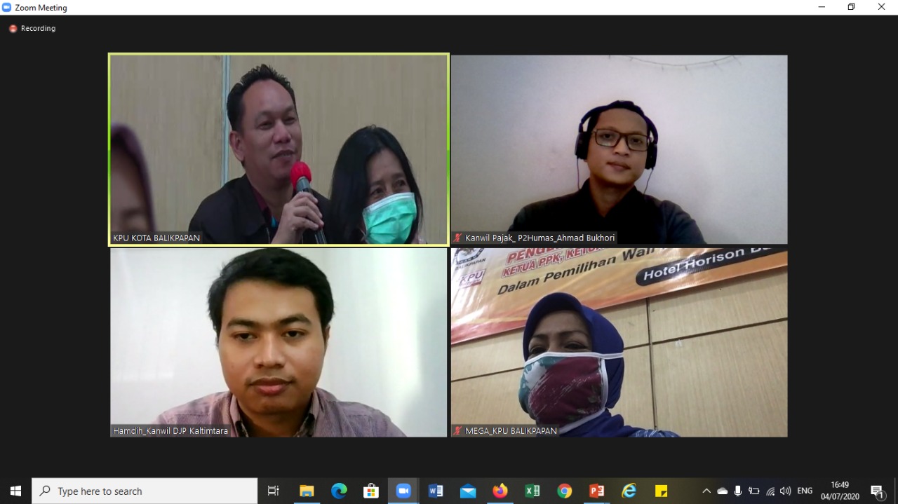 Kantor Wilayah Direktorat Jenderal Pajak Kalimantan Timur dan Utara (Kanwil DJP Kaltimtara) melakukan kegiatan penyuluhan bersama Komisi Pemilihan Umum (KPU) Kota Balikpapan dalam rangka Bimbingan Teknis (Bimtek) Pengelolaan Keuangan Anggaran Pilkada 2020 di Hotel Horison Sagita Balikpapan melalui Zoom Meeting (Sabtu, 4/7). Bimtek berlangsung mulai dari pukul 10.00 WITA hingga 17.00 WITA yang diikuti oleh Ketua dan Sekretariat PPK, Ketua dan Sekretariat PPS terbagi menjadi tiga kelas dengan total peserta sebanyak 160 orang.