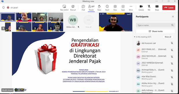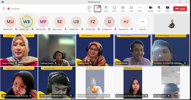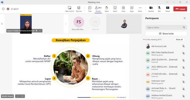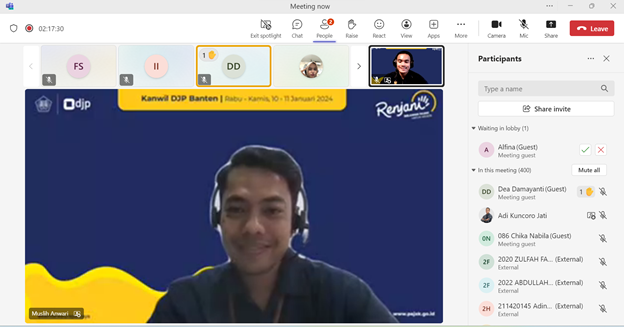 Acara diselingi dengan diskusi dan tanya jawab baik secara langsung maupun melalui kolom chat Microsoft Teams . Kegiatan ini dilaksanakan sebagai upaya Kanwil DJP Banten agar relawan pajak lebih mumpuni dalam menjalani perannya dalam memberikan pelayanan perpajakan kepada wajib pajak.