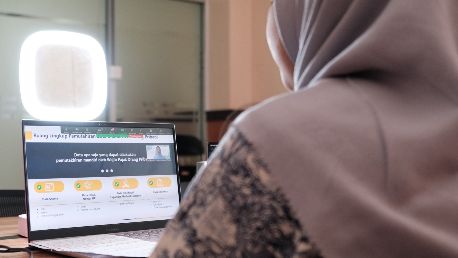 Narasumber menyampaikan bahwa sesuai PMK-136/PMK.03/2023 tentang Perubahan PMK-112/PMK.03/2022 tentang NPWP Bagi Wajib Pajak Orang Pribadi, Wajib Pajak Badan, dan Wajib Pajak Instansi Pemerintah, format NPWP baru berlaku sejak 1 Juli 2024 sehingga perlu dilakukan pemadanan NIK-NPWP yang dapat dilakukan secara mandiri melalui DJPOnline. Sosialisasi ini dilakukan secara daring melalui aplikasi Zoom Cloud Meeting yang diikuti oleh seluruh pegawai Kantor Pusat, Kantor Wilayah, Kantor Area, serta Kantor Unit PT Pelindo Jasa Maritim (SPJM).