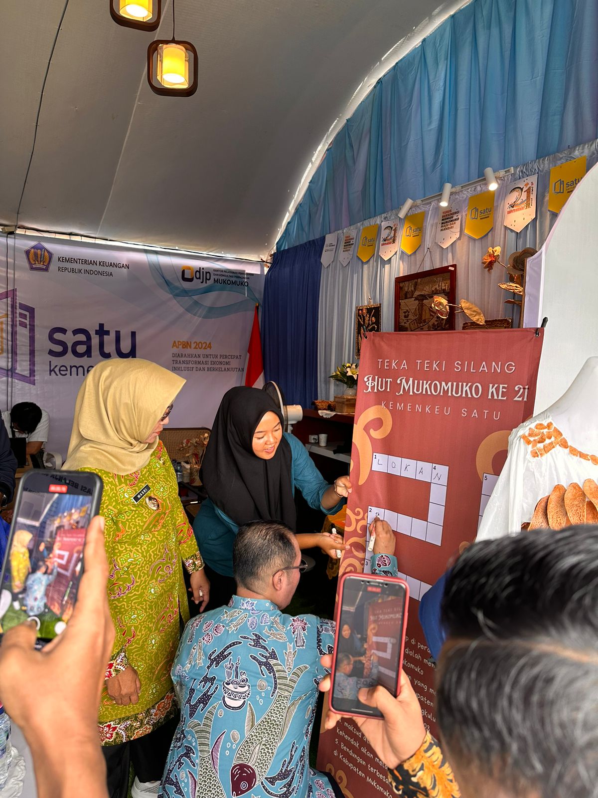 Bupati Mukomuko H. Sapuan, SE., MM., CA., CPA., CPI. dan Wakil Bupati Mukomuko Wasri membuka acara pada pukul 08.00 WIB . Stan pameran Kemenkeu Satu Provinsi Bengkulu tidak ketinggalan dikunjungi Bupati dan Wakil Bupati Mukomuko. Materi tentang Anggaran Pendapatan dan Belanja Negara (APBN) dan Aspek Perpajakan secara umum di jelaskan oleh Kepala KPPN Mukomuko Wahyu Budiarso dan Kepala KP2KP Tomi Wiranto kepada rombongan Bupati dan Wakil Bupati. Diakhir kunjungan Bapak Bupati dan Ibu Wakil Bupati bekerja sama mengisi Teka Teki Silang (TTS) yang disediakan oleh tim.