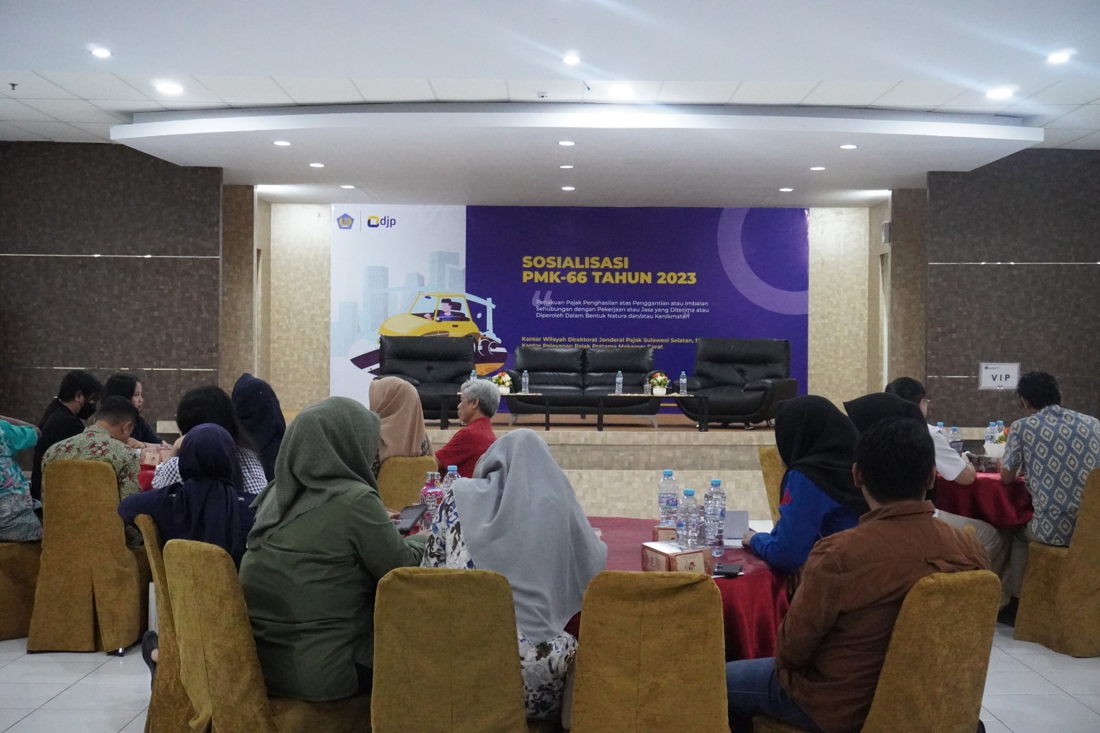 Kantor Pelayanan Pajak (KPP) Pratama Makassar Barat berkolaborasi dengan Kantor Wilayah (Kanwil) Direktorat Jenderal Pajak (DJP) Sulawesi Selatan, Barat dan Tenggara mengadakan kegiatan sosialisasi Peraturan Menteri Keuangan (PMK) Nomor 66 Tahun 2023 di Aula Gedung Keuangan Negara II Makassar, Kota Makassar (Kamis, 3/8).