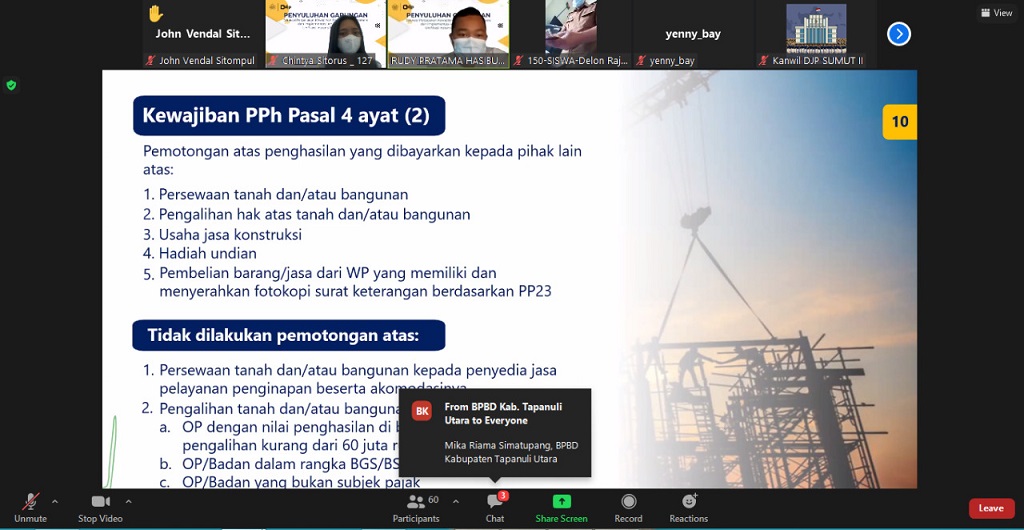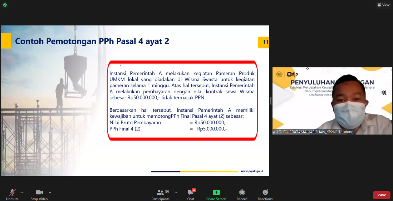 Kantor Pelayanan, Penyuluhan dan Konsultasi Perpajakan Tarutung bersama Kantor Pelayanan Pajak Pratama Balige dan Kantor Wilayah DJP Sumatera Utara II gelar edukasi perpajakan mengenai kewajiban perpajakan sekaligus pengenalan aplikasi e-Bupot SPT Masa Unifikasi dan SPT PPh Pasal 21 kepada Bendahara Instansi Pemerintah Kabupaten Tapanuli Utara. Kegiatan dilakukan secara daring melalui aplikasi Zoom Meeting di KP2KP Tarutung, Kabupaten Tapanuli Utara (Senin, 20/9).